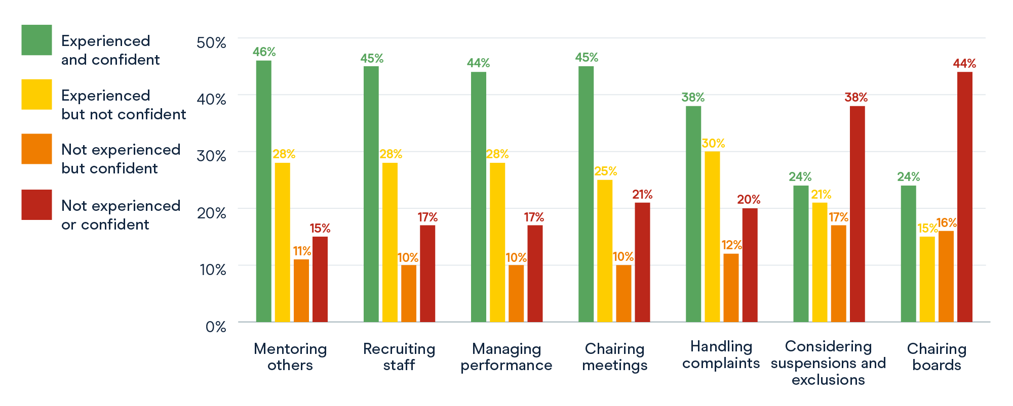 While the 40% who say they are both experienced and confident at chairing boards might seem low, this could be seen as a positive result. It’s unlikely that more than 40% of a board has a chairing role, so we should feel encouraged that perhaps more people than currently get to chair the board (or its committees) could be persuaded to do so in the future, at least when it comes to current confidence and experience levels. Of course, chairing a meeting in the workplace, and chairing, say, an exclusion panel, are very different - and to do the latter well requires governance-specific training for both those aspiring to a chairing role, but also for those currently in the seat.