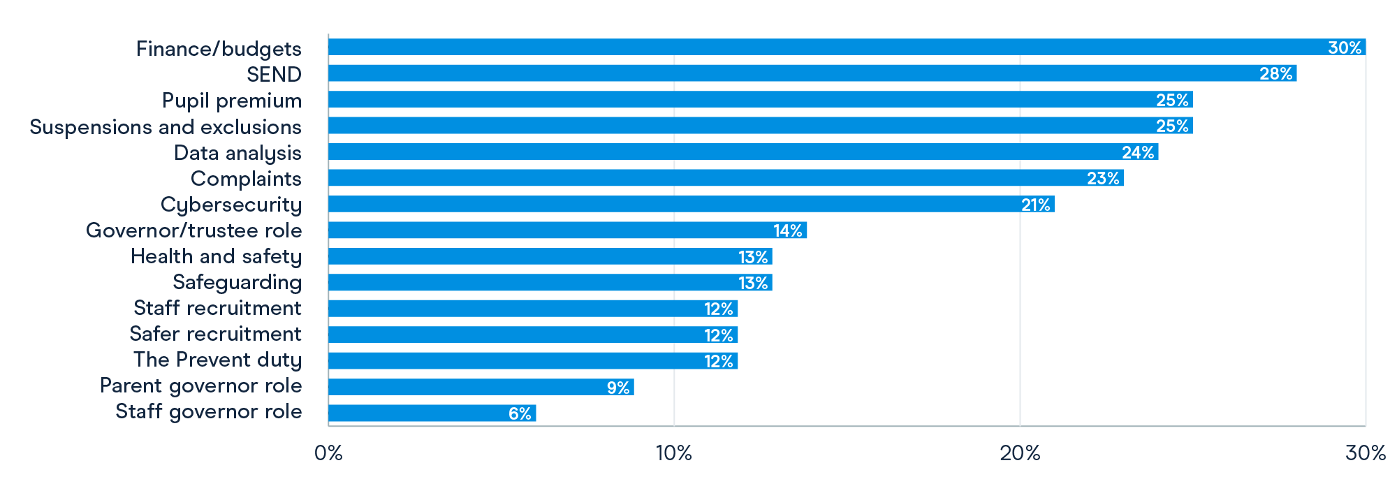 Likewise, 28% are looking for training on SEND - this might of course include the budgeting side of SEND, linked to the previous point around finance. But SEND is a massive topic for schools to grapple with - from resourcing staff, to admissions, to behaviour, to impact of provision, to inclusive policies and the now huge focus from Ofsted. It’s clear that governors continue to need support here - and arguably this will ramp up once the schools white paper, which will include SEND reforms, gets published in 2026.