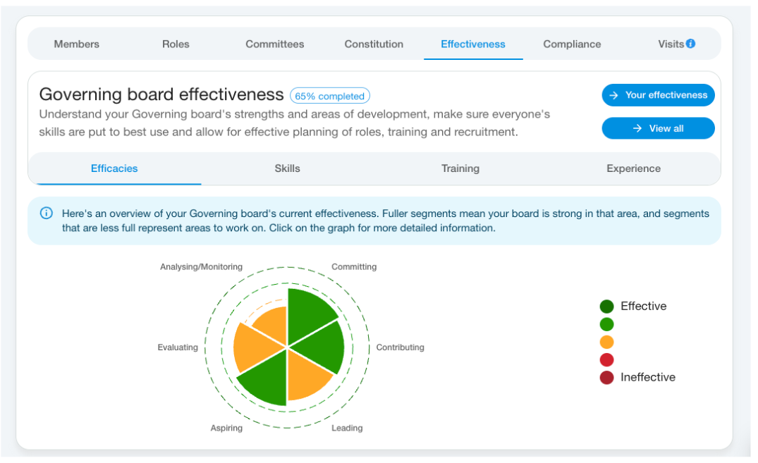 Interestingly, it has not been built as an “audit”, with connotations of something that is done at a point in time “for the record”, but as a tool that allows boards to continually drill into how effective they are at doing the “jobs” of governance - whether that’s contribution to discussion or analysing data. So, “effectiveness” rather than just “skills”. I’m sure anyone who has sat on a board has met, for example, a governor that comes with great finance skills but hasn’t yet translated that into contributing to discussion…or a brilliant COO who hasn’t yet found the balance of operational vs strategic. This is the tool to help.